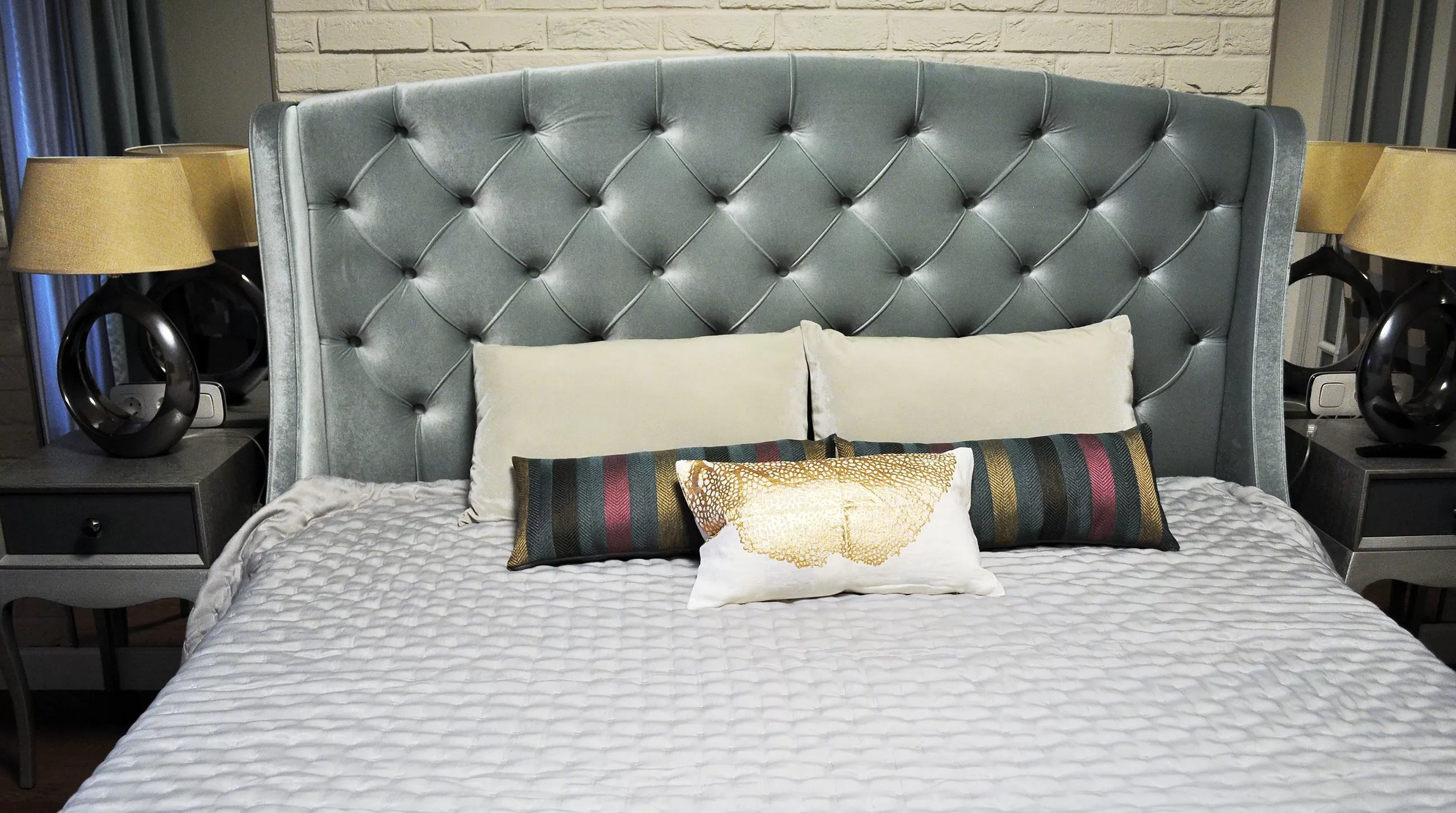 Дизайн высокого мягкого изголовья выполнен, геометрическим рисунком в виде ромбов с утопленными мебельными пуговицами, обтянутыми тканью, так называемой каретной стяжкой, и двумя боковыми элементами, визуально ограничивающими пространство кровати. Материал обивки подбирается индивидуально.