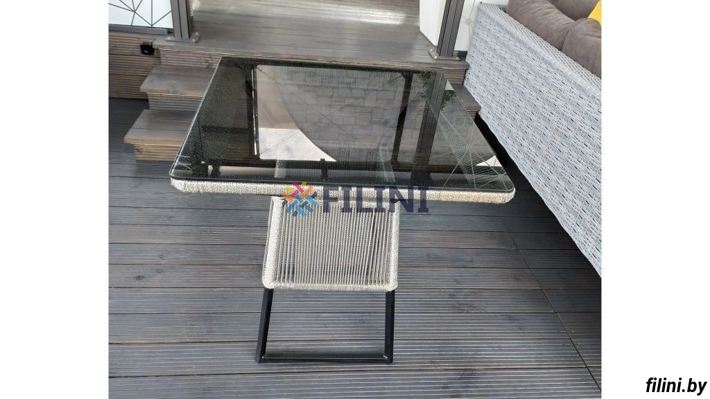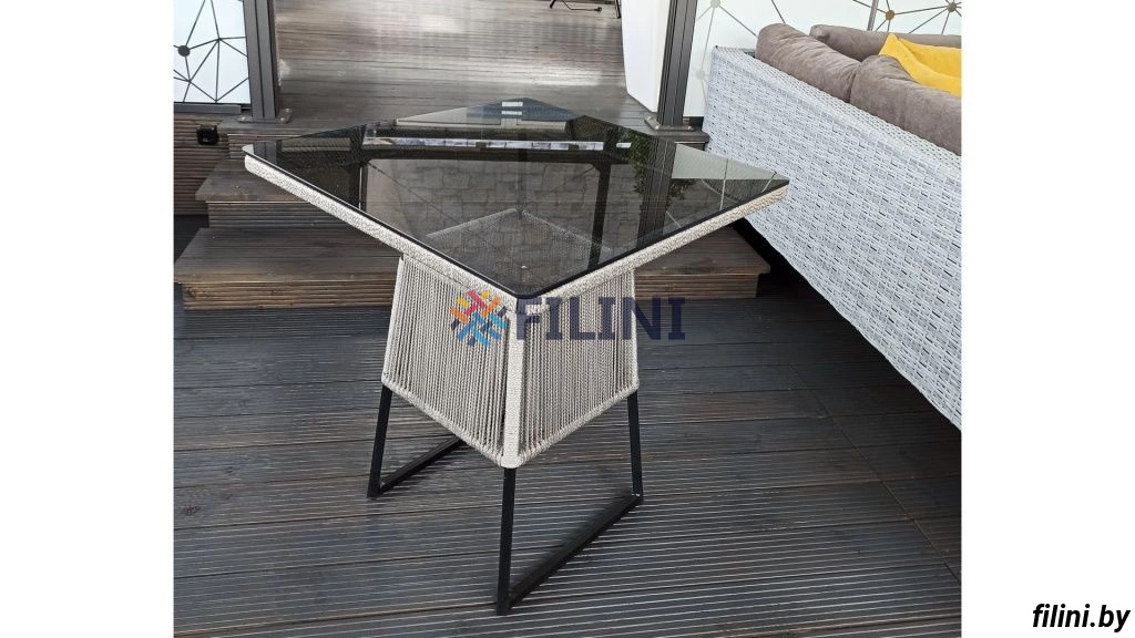 Небольшой обеденный стол "Клауд-2" для террасы уличного кафе и веранды летнего ресторана, из синтетического шнура (веревки) или искусственного ротанга на металлическом подстолье со стеклянной столешницей.