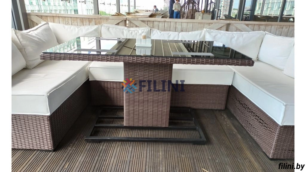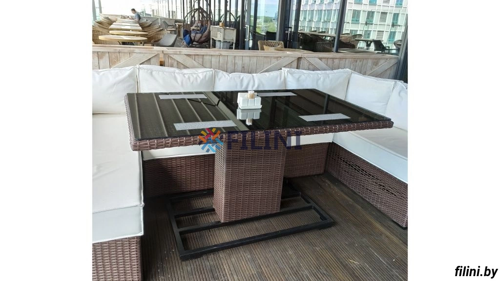 - Столешница выполнена из бесцветного закаленного стекла толщиной 8 мм укладываемого на рамку подстолья с глухим плетением из искусственного ротанга.